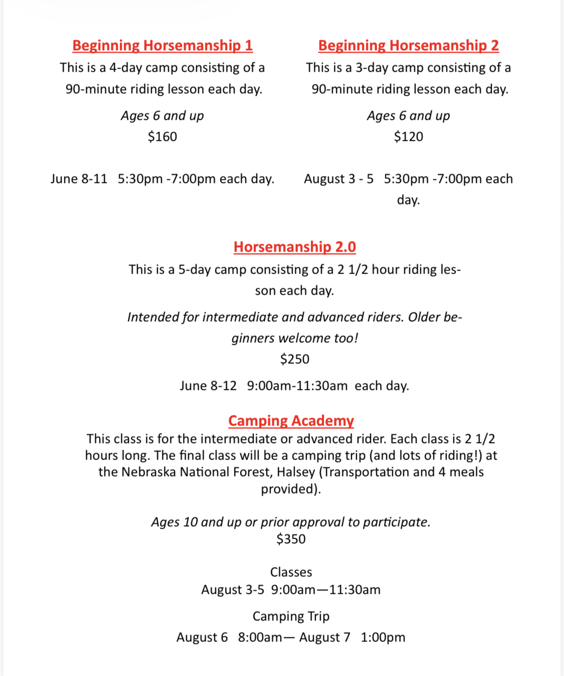 Summer Camping — three lessons followed by an overnight camping trip in the Nebraska National Forest at Hasley. Lots of horseback riding, playing in the shallow river, tent camping, and campfire cooking. 4 meals and all transportation provided.